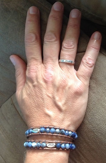 Over the years my “hope” has tried to go down the drain, be lost, and the like. Over the years I’ve lost and recovered the charms through seemingly miraculous means. I’ve now lost two of those precious bracelets in my home or in my car (and I’m not one who loses things easily, so this is always “not so funny, Lord”). My friend recently created a new one for me (see photo) … and I’ve attached myself to hope more securely through a ring on my finger (though, within a week I did something that tarnished the ring in a hurry … “tarnished hope” is a whole new concept to ponder!).